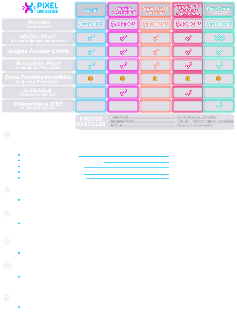 6 salas de juegos interactivos que te transportarán al Universo Pixelarium, una experiencia de diversión digital sin igual. (duración solo de la misión, 60 min aprox).